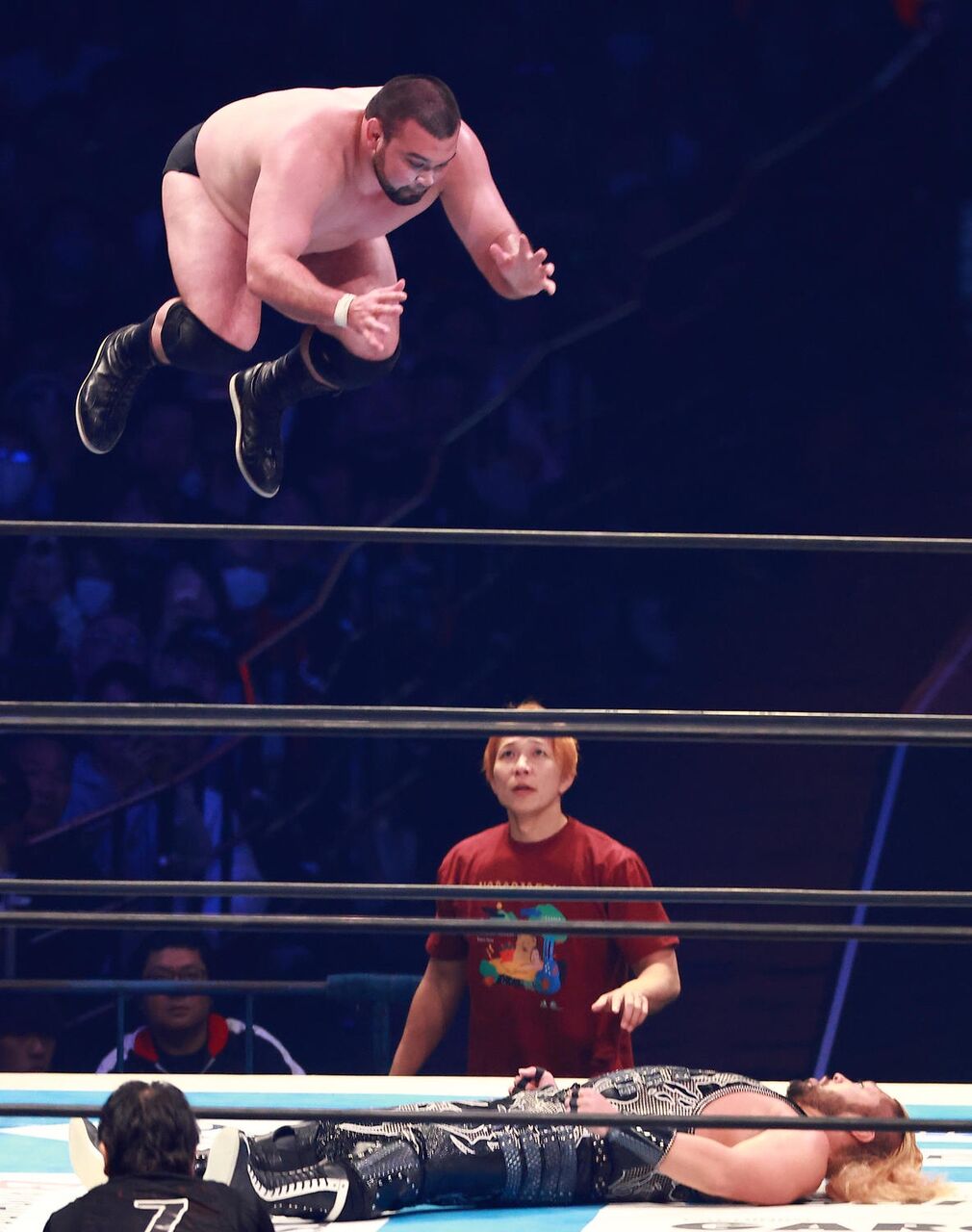 苦しい展開が続く中で、カウンターのパワースラムで反撃開始。ボディースラムからコーナーへ。コーナーポストからこの日、引退する棚橋弘至の必殺技ハイフライフローをさく裂。試合が決まってかと思ったが、セコンド介入で勝ちきれず。このあとも相手のファレによるダイビングボディプレスを被弾して、テーブルクラッシュした。