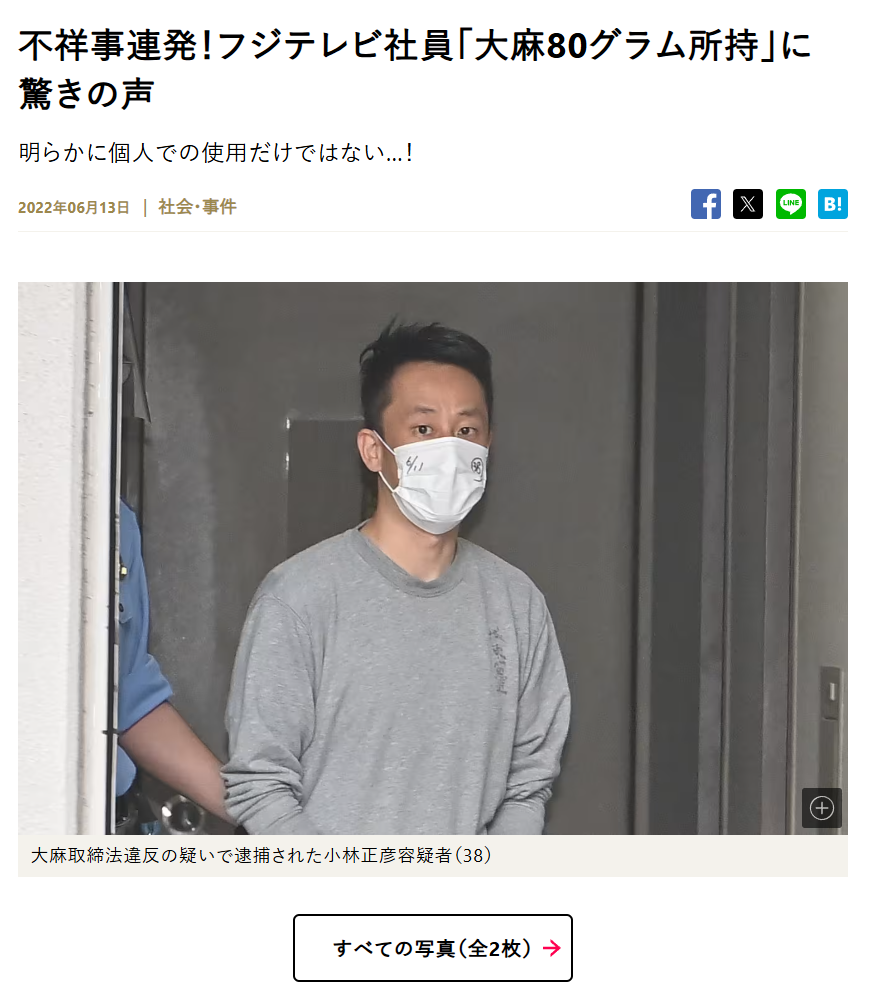 中居の有料サイト運営してたフジテレビ局でチーフディレクター編成制作局所属の社員が*所持で逮捕されてる