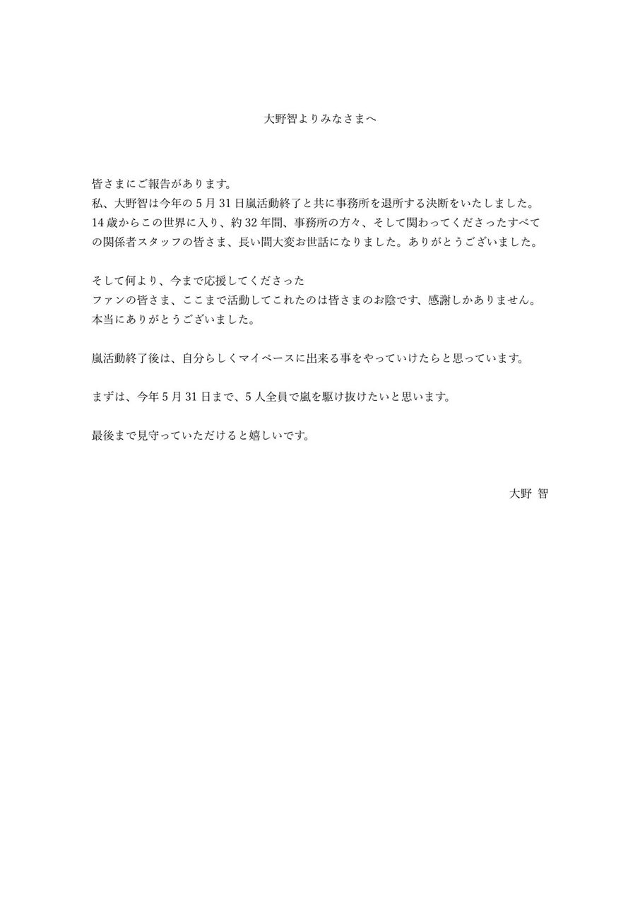 嵐の大野智が28日、所属する「STARTO ENTERTAINMENT」を、グループが活動休止する5月末をもって退所することを、同社公式サイトなどで発表した。