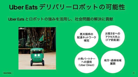 | Uber Eats、米国に続き世界2か国目の「ロボットデリバリーサービス」を3月中に東京都内で開始へ 三菱電機やCartkenと業務提携 Uber Eats Japan、三菱電機、Cartkenは2月21⽇、⾃律⾛⾏ロボットを使⽤したオンラインデリバリーサービス「ロボットデリバリーサ… (出典:Car Watch) |