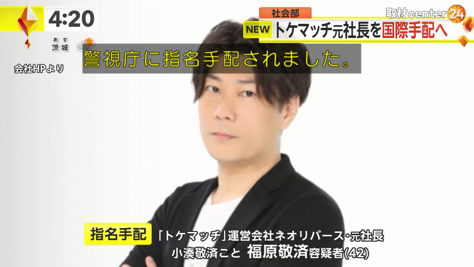 | 高級腕時計シェアサービス「トケマッチ」元社長の男(42)を指名手配…1月下旬に海外出国 国際手配へ …計シェアリングサービス「トケマッチ」について、運営会社の元社長の男が警視庁に指名手配された。 指名手配されたのは、トケマッチの運営会社「ネオリバース」… (出典:FNNプライムオンライン(フジテレビ系)) |