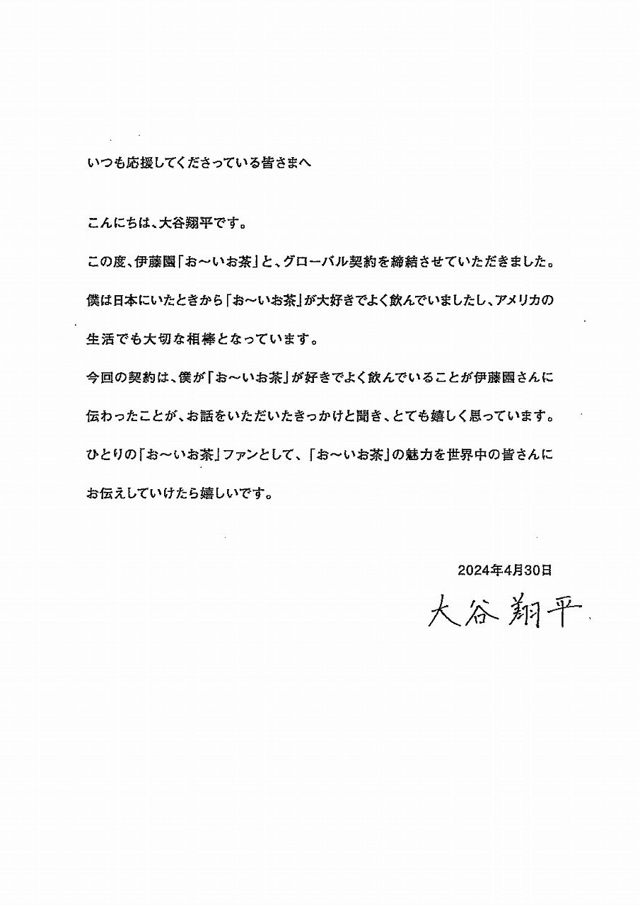 @ST345M大谷翔平「いつも応援してくださっている皆さまへ」→愛飲する『お~いお茶』について発表【コメント全文】 | ORICON NEWS oricon.co.jp/news/2324950/f…