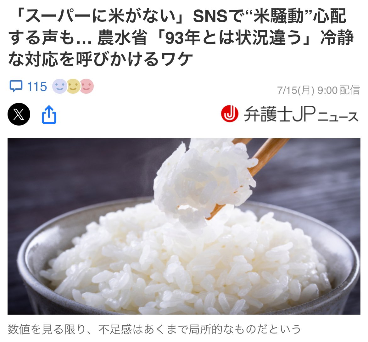 前出の担当者は「一部いろいろな事情があったとしても、たとえば1993年の大凶作とは状況が全く違う」と続ける。