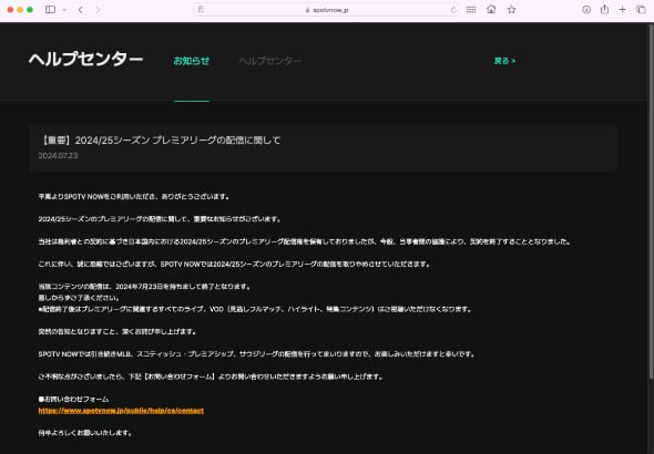 そんな中、23日にリリースを発表。「2024/25シーズンのプレミアリーグの配信に関して、重要なお知らせがございます」とし、「当社は権利者との契約に基づき日本国内における2024/25シーズンのプレミアリーグ配信権を保有しておりましたが、今般、当事者間の協議により、契約を終了することとなりました」と説明。3シーズン目だったはずだが、配信をしないこととなったという。