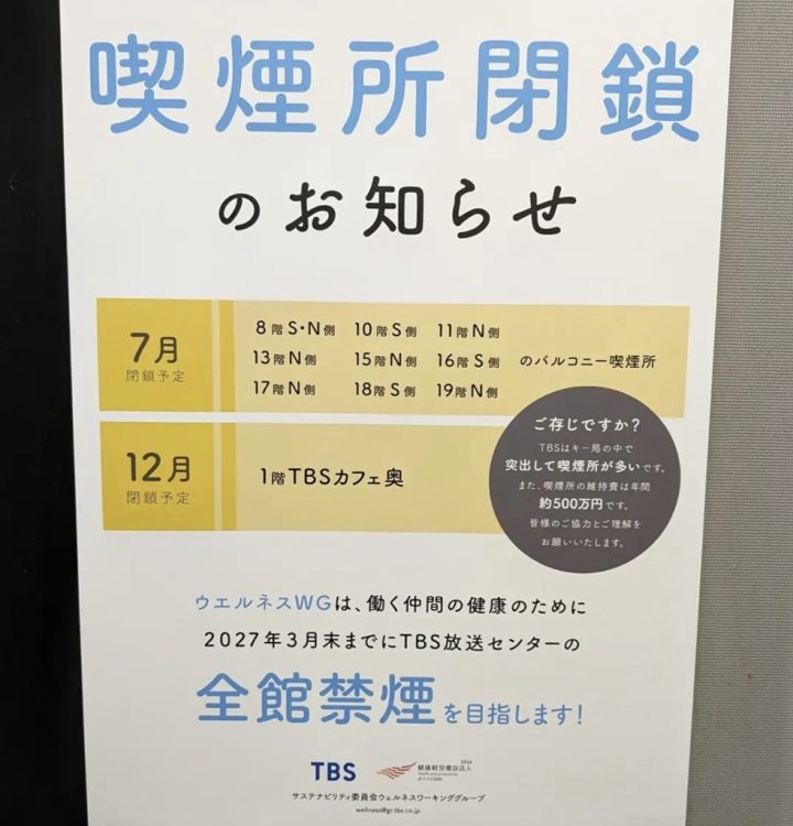 TBS局内の喫煙室付近に「喫煙所閉鎖のお知らせ」と書かれたポスターが貼られたのは、今年5月頃のことだった。ポスターには大きく「2027年3月末までにTBS放送センターの全館禁煙を目指します!」という意気込みが記載されている。喫煙者だというTBSの関係者はこう話す。