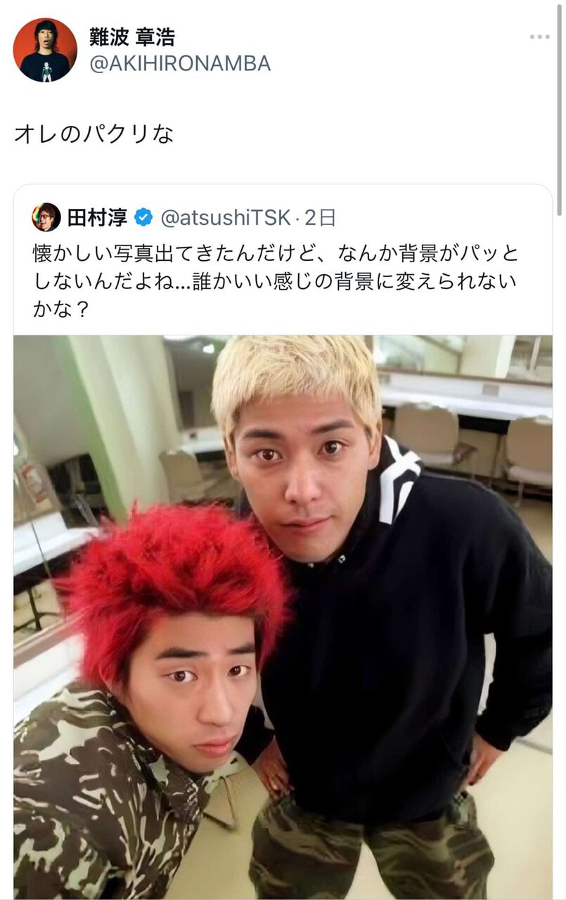 9月4日、Xに「赤髪」だった頃の自身と相方のツーショット写真を投稿したロンドンブーツ1号2号の淳こと、田村淳。かつてお笑い界でアイドル的な人気を誇った、若かりし頃の淳と亮のツーショットは2984万回ものインプレッションを記録する大バズりとなったが、このポストに《俺のパクリな》と、人気ミュージシャンが、突如噛み付いた。