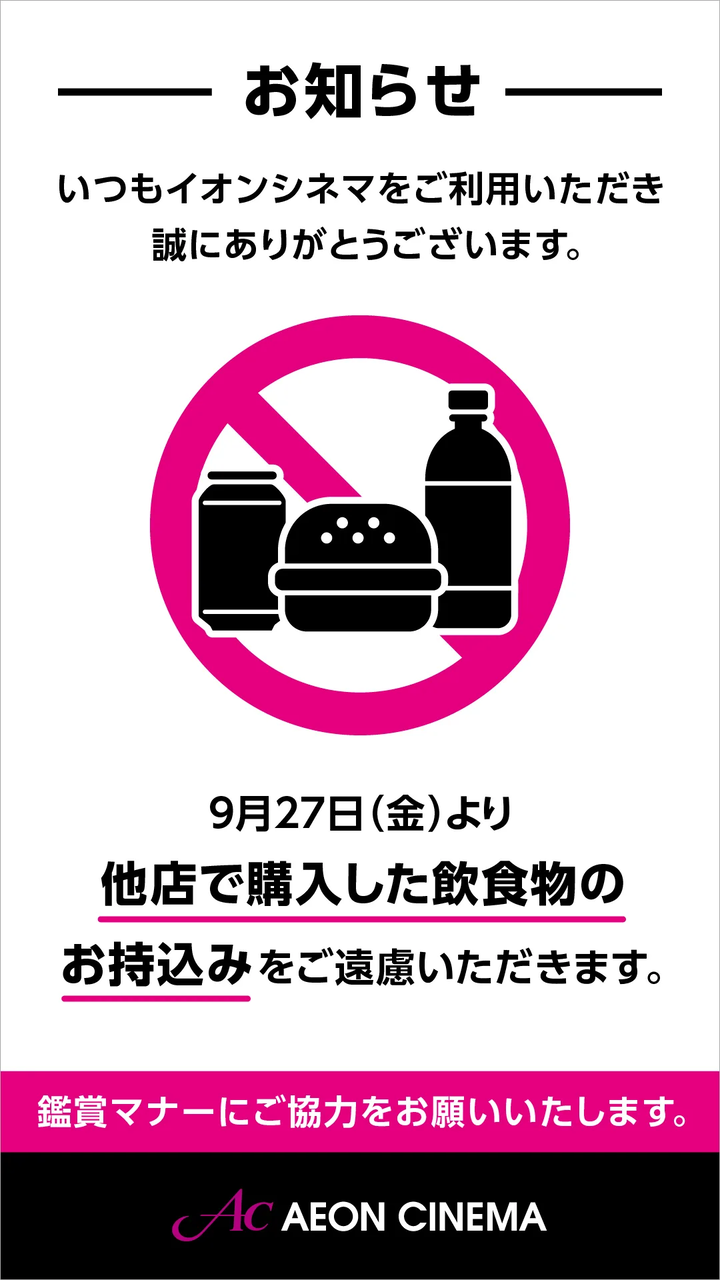 イオンシネマは今年9月27日より、「他店で購入した飲食物のお持ち込みをご遠慮いただきます」との新しいルールを発表した。