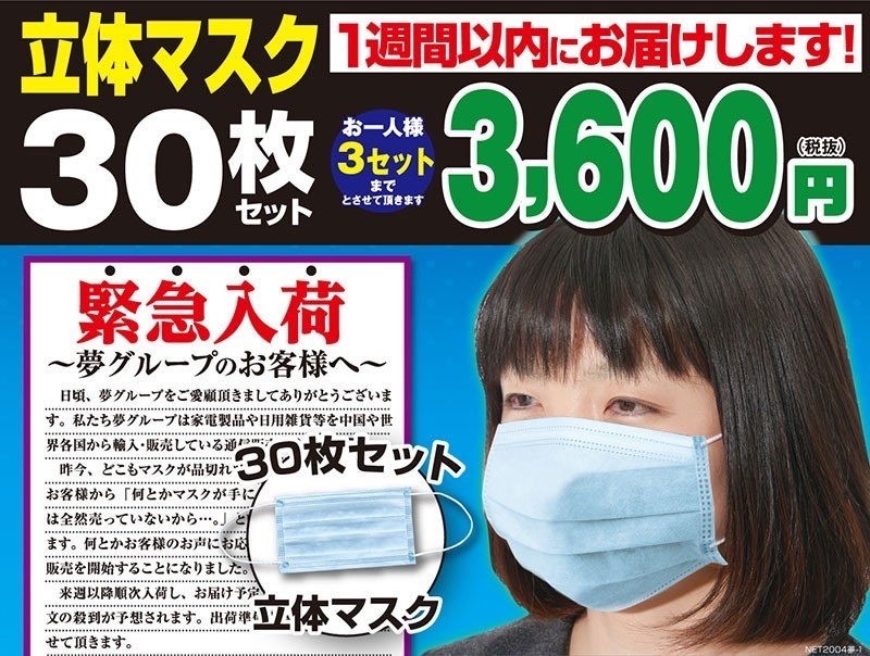 消費者庁によると新聞広告で「立体マスク30枚セット3600円」「本日の広告の有効期限5日間」と表示。あたかも掲載日から5日間に限り3600円で購入できるかのように宣伝していた。